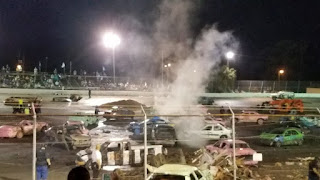 We went to Winter Haven to see Night of Destruction at the Auburndale Speedway. All kinds of antics with racing cars. No rules, no cleanup. It was the best night ever in racing. They raced buses in figure eight, cars with trailers behind them, (even an RV). There were cars racing around another car on pile of dirt. One race was playing soccer. Debris everywhere. The last race the winner was the last car running. We laughed till we had tears. They are doing it again in November, yep, we'll be there. The place was packed. We had a quick downpour so we sat wet the last hour, but it was all ok. Here's pictures of the races, I hope you can see the video it's really funny cars chasing a soccer ball, green team again pink.