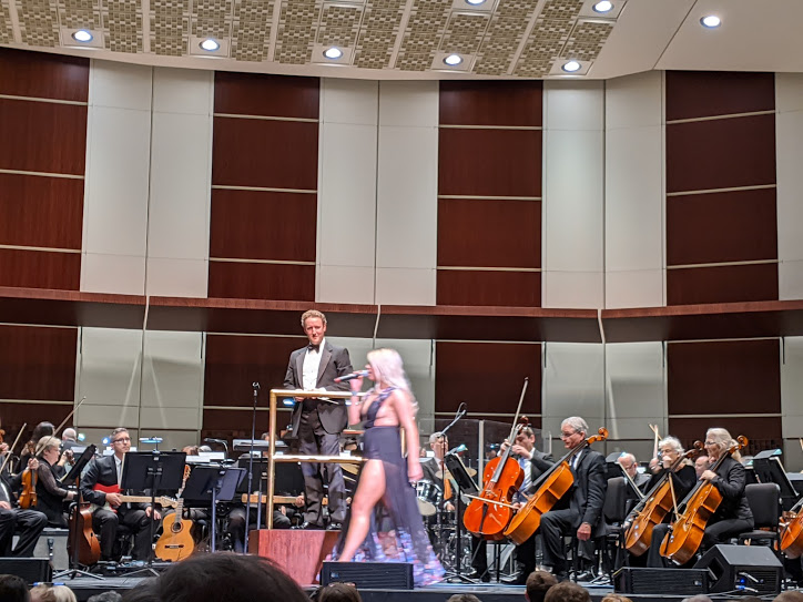 The orchestra played Bond movie songs. The conductor is from England so he did a lot of playing around with the crowd. The singer was Chloe Lowery. She sang a few of the songs. (Click on the photos to enlarge).